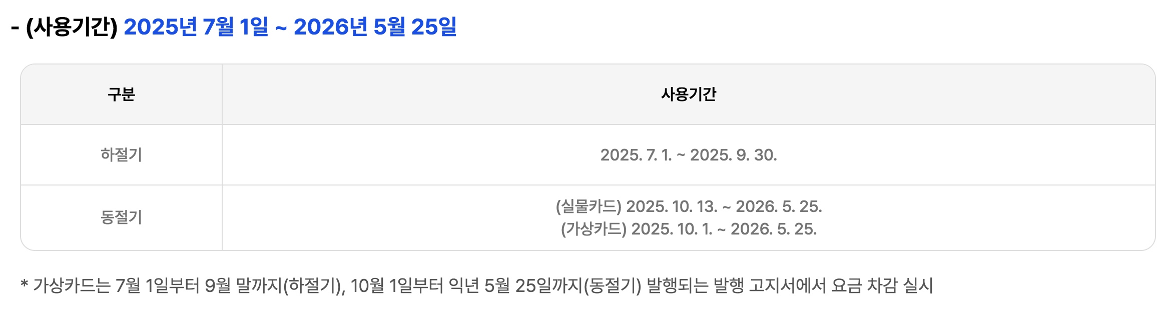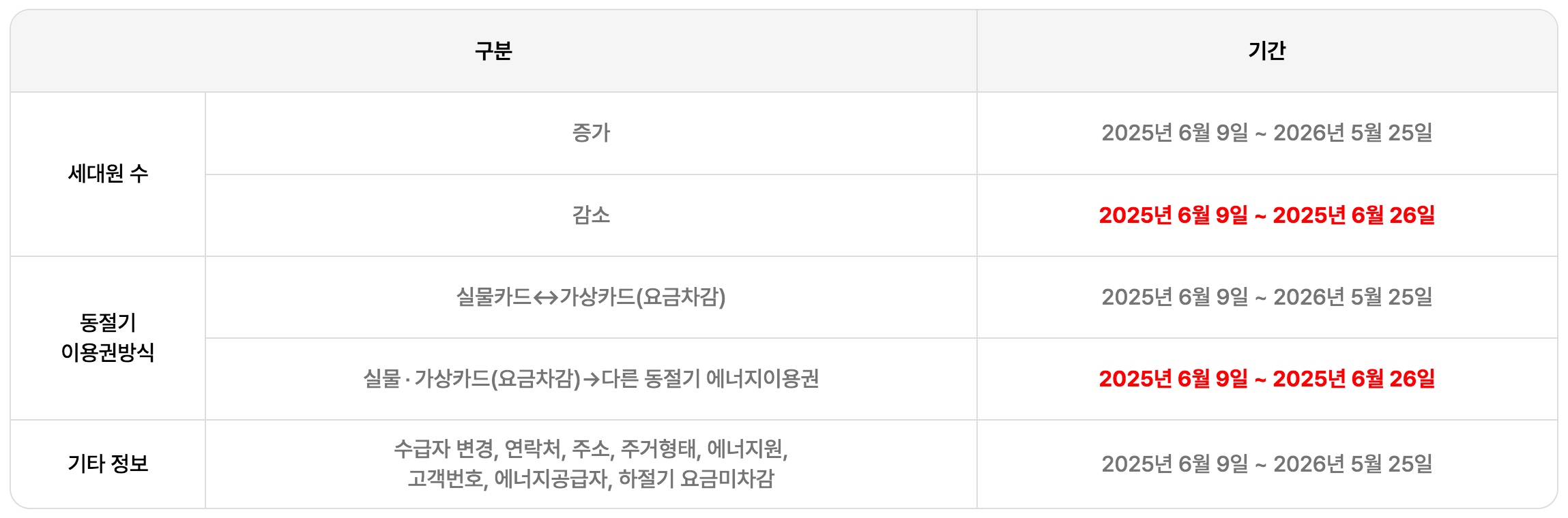 동·하절기 구분 없는 자유로운 사용: 2025년부터는 지원금액이 동·하절기 구분 없이 사용 기간(2025년 7월 1일 ~ 2026년 5월 25일) 동안 자유롭게 사용 가능합니다. 이는 사용자의 편의성을 높이고, 필요에 따라 유연하게 에너지를 사용할 수 있도록 한 개선 사항입니다.