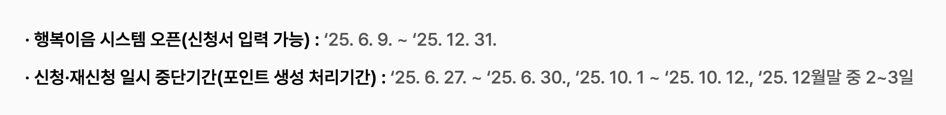 신청·재신청 일시 중단기간: 포인트 생성 처리 기간으로 인해 2025년 6월 27일 ~ 2025년 6월 30일, 2025년 10월 1일 ~ 2025년 10월 12일, 그리고 2025년 12월 말 중 2~3일간은 신청 및 재신청이 일시적으로 중단될 수 있으니 미리 확인하고 신청하는 것이 좋습니다.