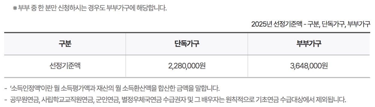 2025년 선정기준액은 24년 213만원에서 15만원 인상된 단독가구 월 228만원 이하, 24만원이 인상된 부부 가구 월 364만 8천원 이하 입니다.