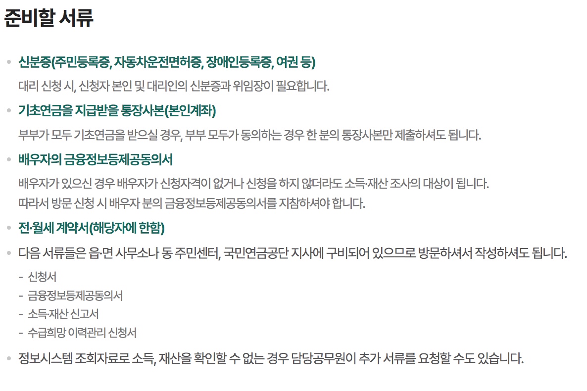 기초연금을 신청하기 위해서는 다음과 같은 서류들이 필요합니다. 대부분의 서류는 주민센터, 국민연금공단 지사에 비치되어 있어 방문하여 작성하실 수 있습니다.
