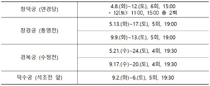 경복궁, 창덕궁, 덕수궁, 창경궁 등 4대궁에서 오는 4월과 5월, 9월에 걸쳐 무료로총 29회의 국악공연이 펼쳐진다. 국가유산청 궁능유적본부는 국립국악원과 함께 4대궁에서 조선 - 정책브리핑 |